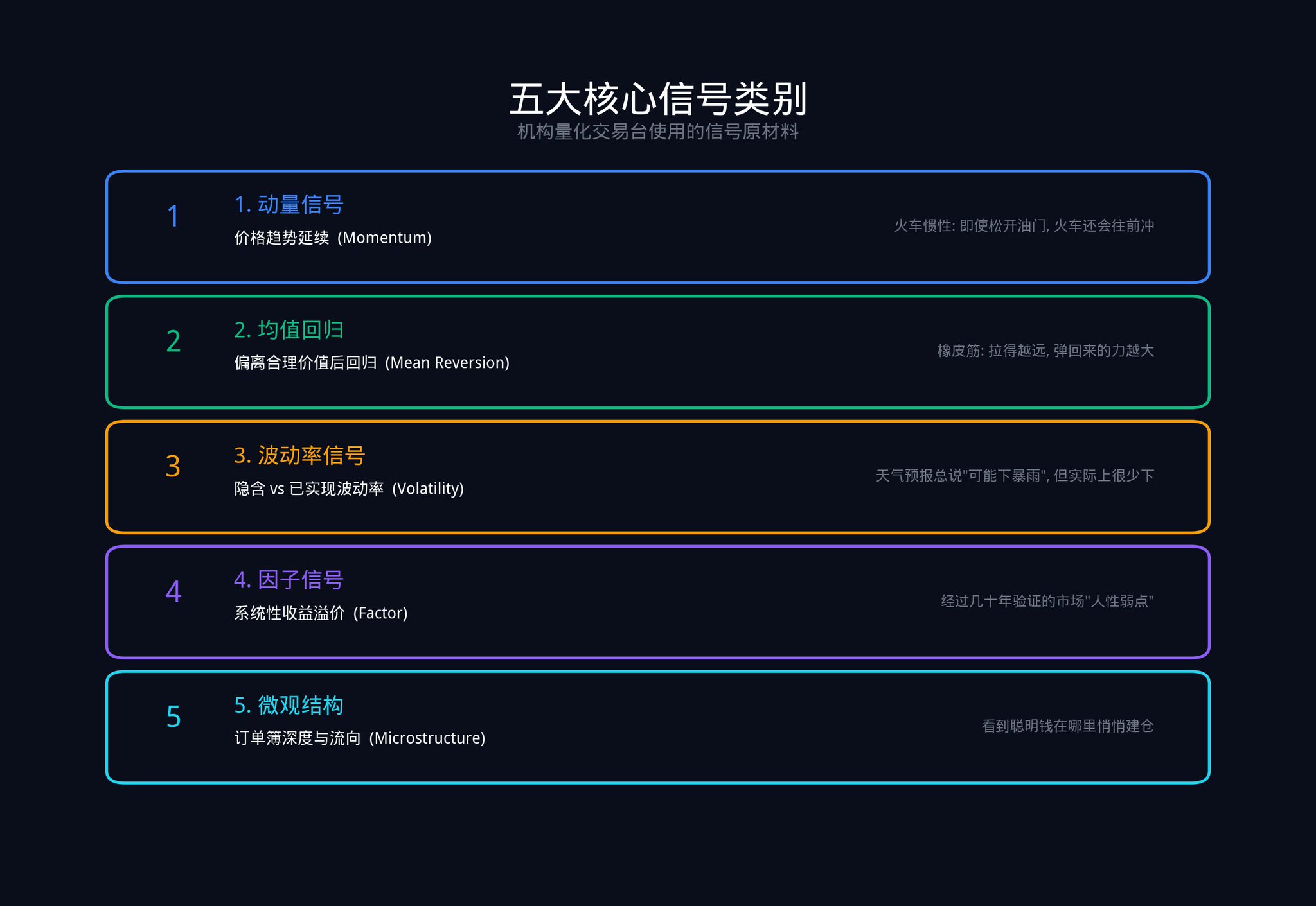 但在机构的量化框架里,信号是一个可测量的、与未来价格或概率变动具有统计学上可重复关系的数据点。