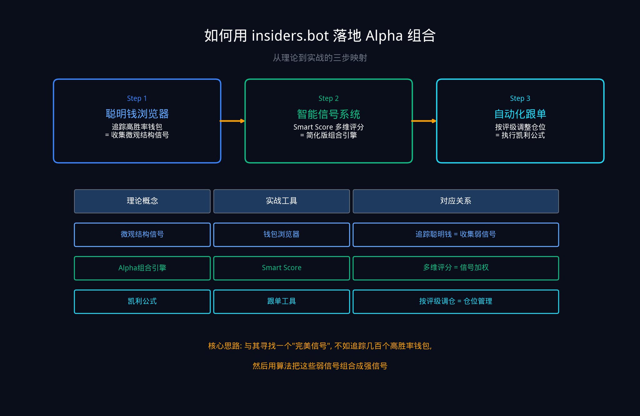 这些钱包的每一次异动,就是你的一个「微观结构信号」(还记得第二部分讲的五大信号类别中的第五类吗?)。单个钱包的信号可能很弱(IC 很低),但当你同时追踪几十个钱包时,你就在做文章里说的「信号组合」。这正是主动管理基本定律的核心:N 越大,IR 越高。