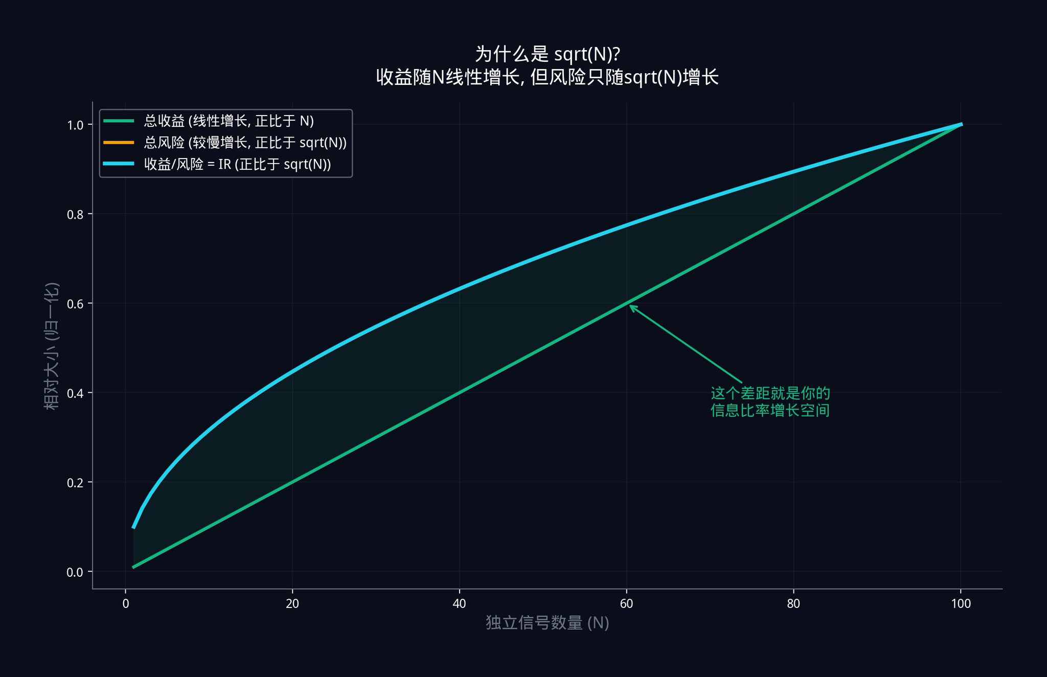 上图展示了这个关系。绿色的线是总收益,它随着信号数量线性增长。蓝色的线是信息比率 IR,它随着 √N 增长。收益在涨,风险也在涨,但收益涨得比风险快。两条线之间的差距越来越大。 这个差距,就是你通过增加独立信号获得的交易优势。