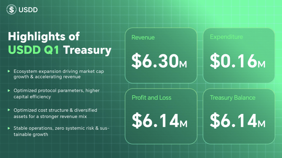 日前,去中心化稳定币USDD对外披露了2026年第一季度业绩数据。数据显示,本季度USDD实现收入630万美元,环比增长66.6%;实现利润614万美元,环比增长77.9%;支出降至16万美元,环比下降51.6%;金库余额按披露口径环比提升77.9%。尤为值得关注的是,总金库余额达到1391万美元,进一步体现出USDD在盈利沉淀、风险缓冲与可持续发展方面的稳健基础。整体来看,USDD在2026年开局阶段延续了强劲增长势头,并呈现出更加鲜明的“降本、提效、增韧性”特征。