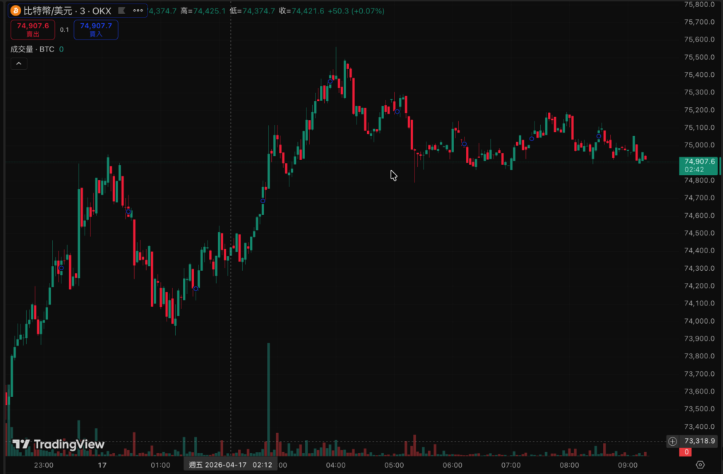 加 密市場今晨上演多空激戰戲碼。比特幣昨夜在美股 Nasdaq 創下歷史新高的外溢效應下一度衝上 $75,404 美元高點,隨後迅速回吐漲幅、最低下探 $73,501 美元,24 小時波動區間接近 $1,900 美元。現貨價格暫報 $74,954 美元,24 小時微幅上漲 0.5%。以太坊走勢更顯吃力,衝擊 $2,367 美元未果後下殺至 $2,291 美元低點,暫報 $2,345 美元,24 小時小跌 0.2%