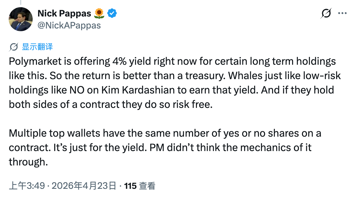 Nick Devor 就此表示,4% 的年化收益率已高于实时美债回报率(5 年期为 3.98%),巨鲸会更偏好这种低风险持仓,比如买入詹姆斯或卡戴珊的 NO(反正都一样,谁红买谁呗),以获取这部分收益;如果同时持有 YES 和 NO 双方份额,则可以实现无风险收益。