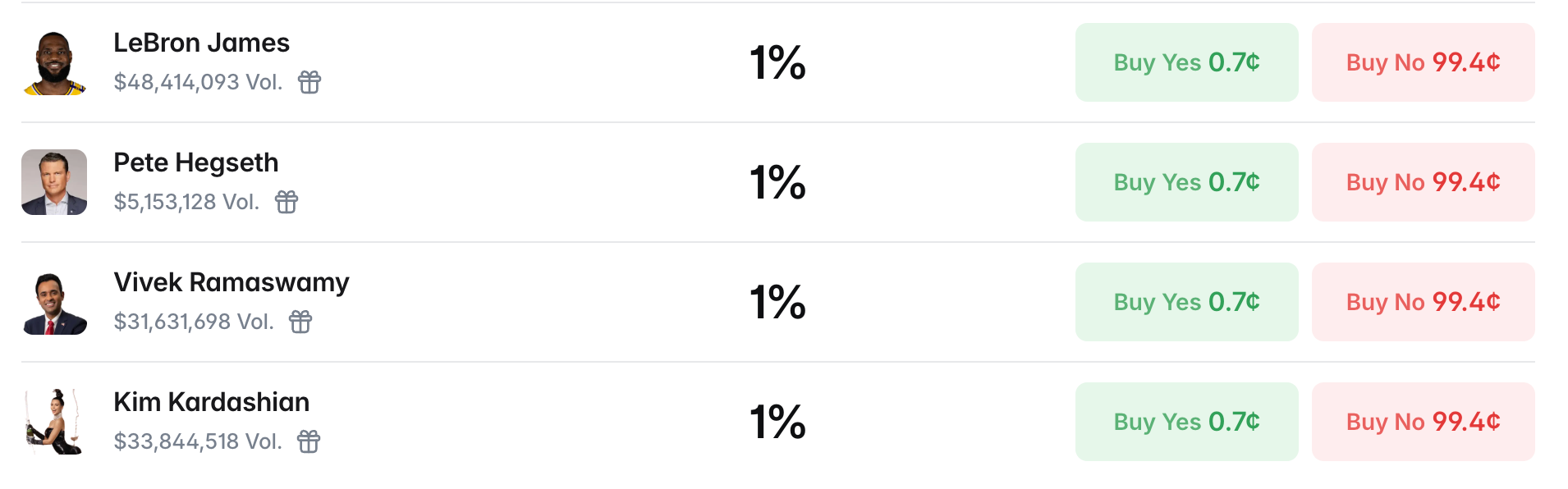比如交易量最高的竟然是 NBA 球星勒布朗·詹姆斯(LeBron James,交易量 4841 万美元),紧随其后的则是娱乐圈名媛金·卡戴珊(Kim Kardashian,交易量 3384 万美元),再往后甚至还有些根本没有美国公民身份(不符合参选规则)的候选人,比如世界首富马斯克(Elon Musk,交易量 2314 万美元),纽约市长马姆达尼(Zohran Mamdani,交易量 1839 万美元)……