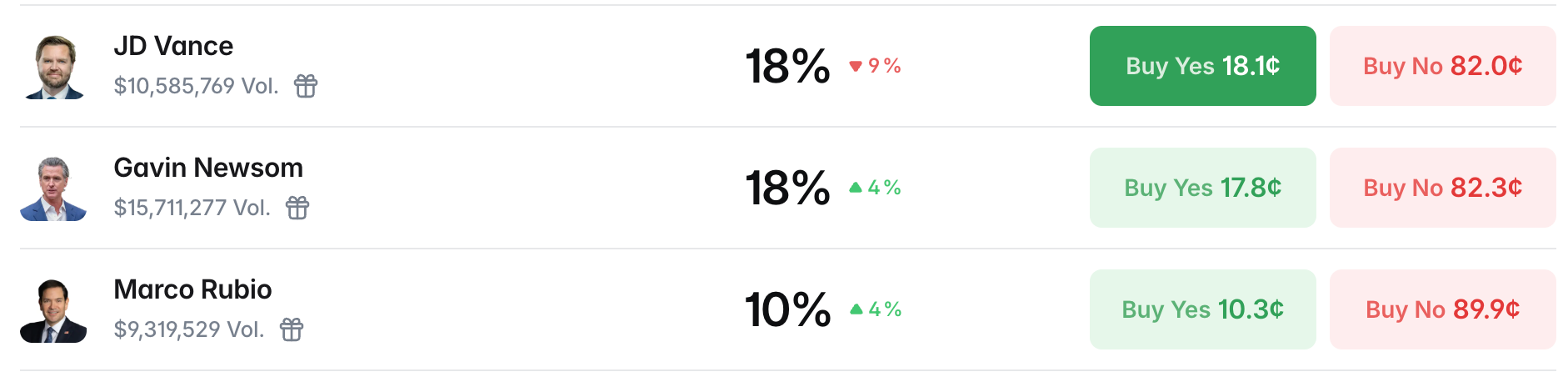 至于那些真正的高概率候选人,比如实时概率领先的副总统万斯(JD Vance,交易量 1058 万美元),加州州长纽森(Gavin Newsom,交易量 1571 万美元),国务卿鲁比奥(Marco Rubio,交易量 932 万美元),交易量均远低于上述“网红候选人”。