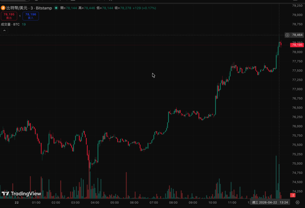 特幣今日強勢突破 $78,000 關口,截至臺灣時間 4 月 22 日下午,BTC 現報 $78,389.79 ,單日漲幅 +3.19% ,24 小時交易區間介於 $74,821.57 至 $78,450 之間,站上近 14 天以來的價格高點。以太幣同步跟進,ETH 現報 $2,393.21 (+3.21%),距 4 月 18 日峰值 $2,451 約 2.4% 之差。