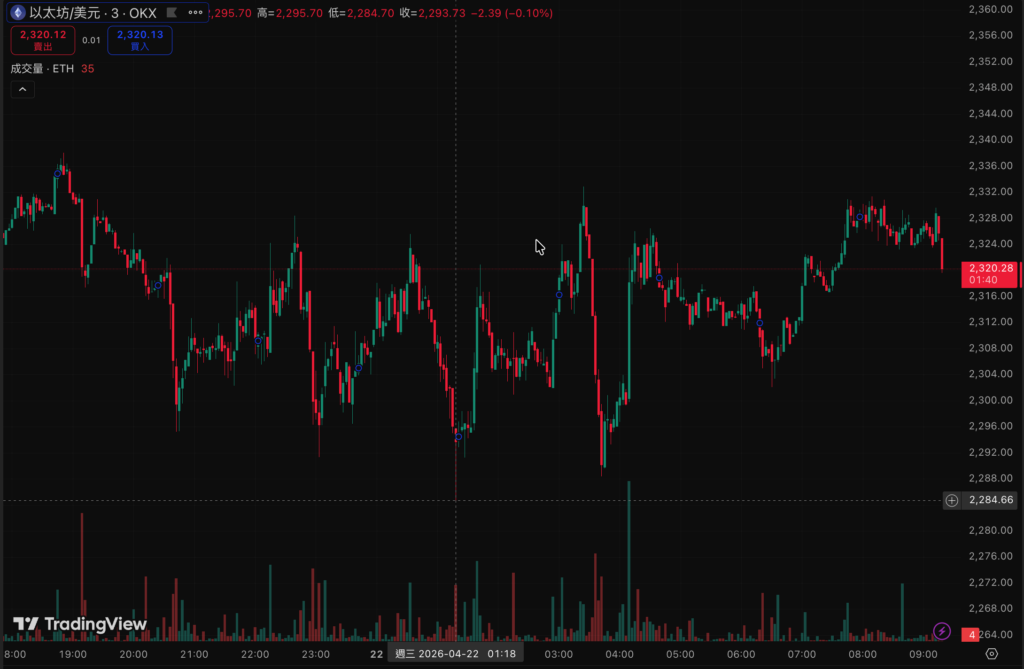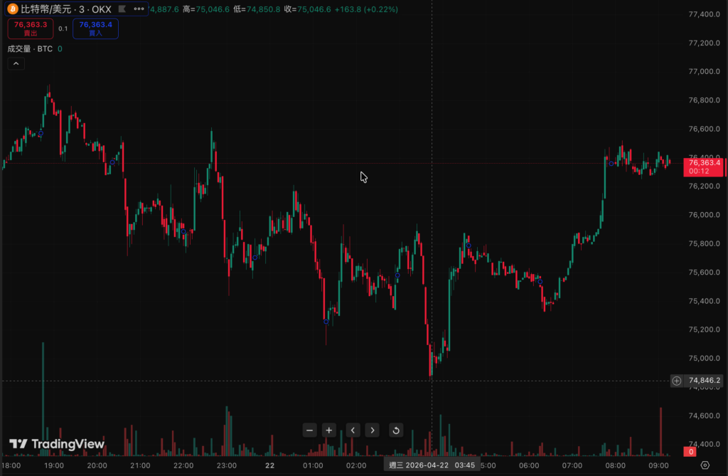 比 特幣在歷經一輪 V 型反彈後,進入短線橫盤整理格局。自 4/13 17:00 觸及低點 $70,678 之後,市場買盤逐步回籠,今晨(4/22 09:00)現報 $76,323,24 小時在 $74,821–$76,927 的狹窄區間內反覆震盪。以太坊同步延續修復走勢:4/9 22:00 跌至 $2,164 低谷後,4/18 01:00 衝上 $2,451 峰值,今晨窄幅收復 $2,300 關口,現報 $2,324,24 小時漲幅 +0.12%。