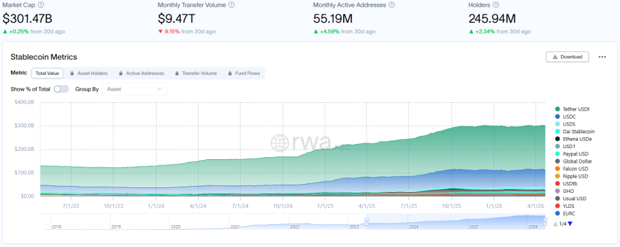 RWA.xyz 最新数据披露,截至2026年4月24日,RWA 链上总市值达300.5亿美元,环比上月同期大涨10.24%,创近期新高,成为规模扩张的主引擎。资产持有者总数增至约73.32万,环比上月同期增加3.49%,显著低于资产增速,表明整体用户扩张放缓。