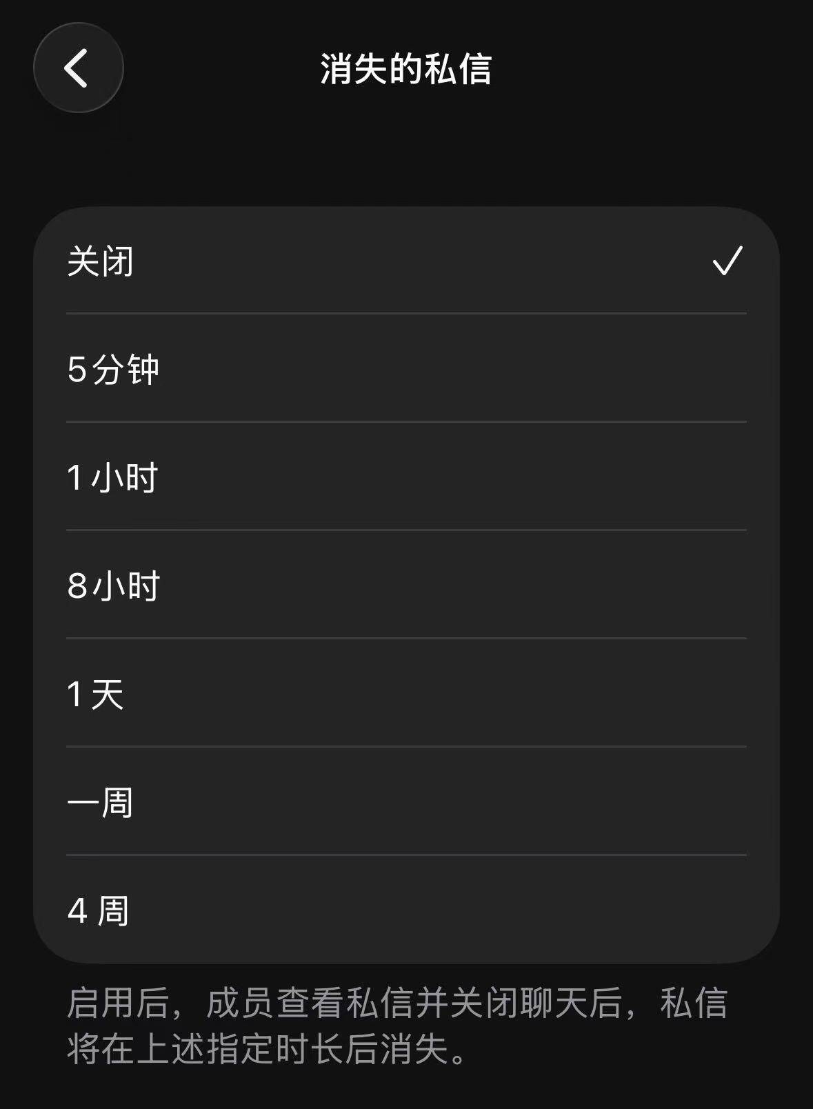 在 XChat 的群组设置中,点击【消失的私信】后,可以对群组消息的阅后即焚时长进行设置,时间分为:5 分钟、1 小时、8 小时、1 天、一周、4 周。
