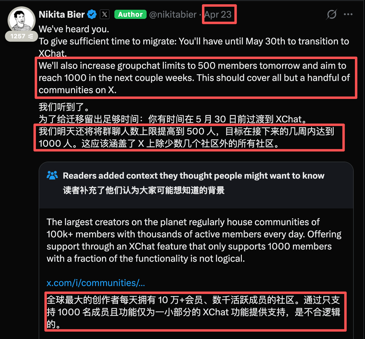前不久,Nikita 本人发文公告将 X 平台原本的 Community(社区)功能迁移至 XChat 群组,并提醒过渡时间将截止于 5 月 30 日。