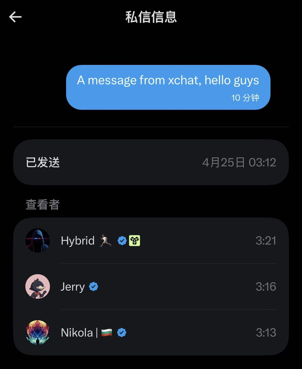 个人尝试,XChat 界面的消息和 X 平台群组界面的消息类似,只不过多了一个【已加密-是】的显示。