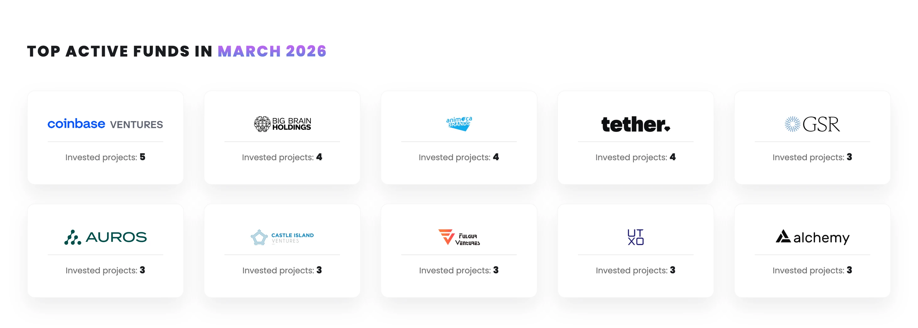 Coinbase Ventures 以参投 12 笔位居机构投资者参投次数榜首,领先第二名逾一倍。其后依次为:Tether(8 笔)、Animoca Brands(7 笔)、CMT Digital(6 笔),以及 a16z crypto、Castle Island、Big Brain、Galaxy Digital(各 5 笔)并列。