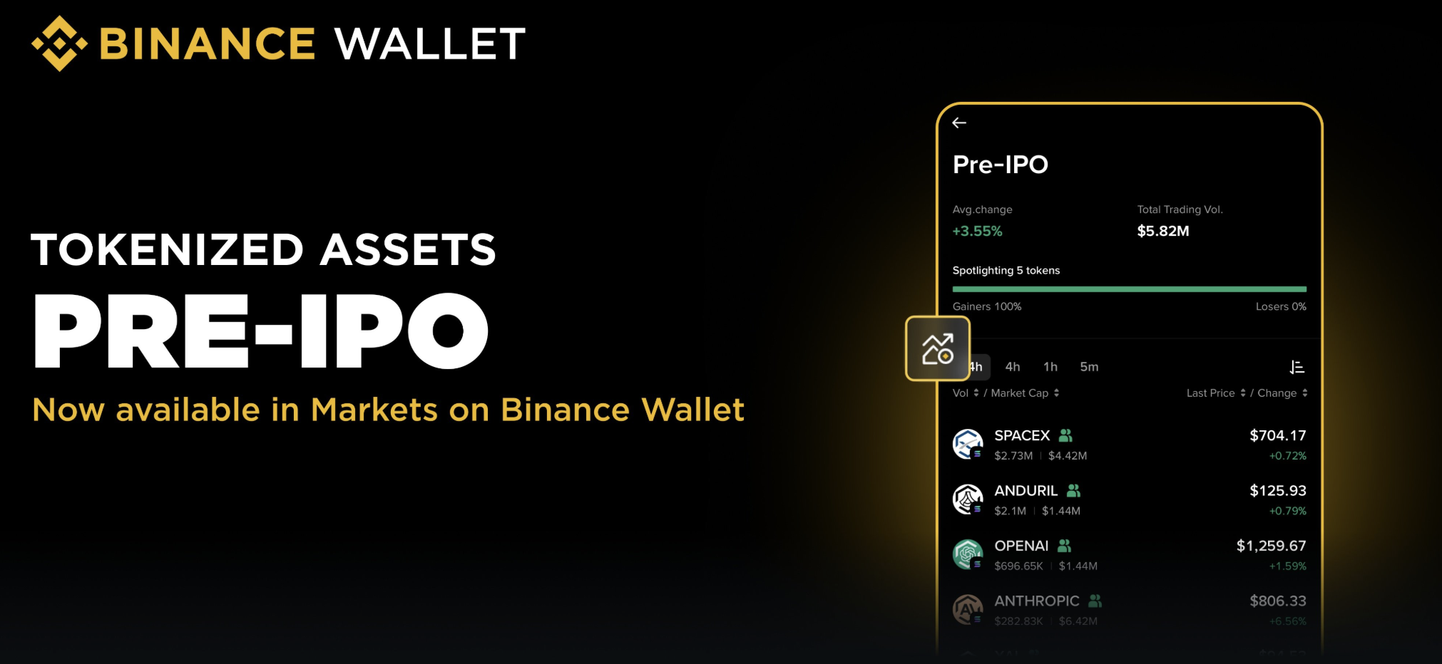 比如,在Perp DEX赛道,YZi Labs支持的Aster不断扩张市场份额,引发永续合约大战,进一步扩张整体赛道份额;在预测市场领域,币安钱包集成Predict.fun等功能,让用户可直接在App内调用现货或资金账户余额,对体育、经济、世界事件、文化及加密货币等领域的未来结果进行交易,大幅降低参与门槛;在代币化股票领域,币安与Ondo Finance合作,普通用户可以直接通过钱包交易超过100种代币化美国股票,包括英伟达、谷歌、苹果和特斯拉等热门股,甚至还在近期上线SpaceX、OpenAI、Anthropic等明星级Pre-IPO资产;随着加密与大宗商品融合成为趋势,币安也上线了原油、黄金、白银等交易产品,交易量超过了不少传统大宗商品交易所。