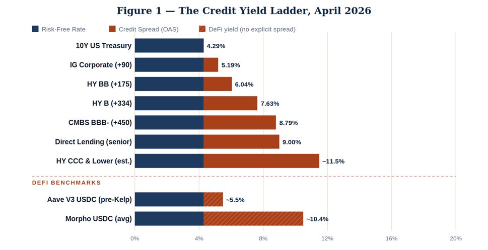 反观 DeFi 市场:KelpDAO 事件爆发前,Aave 的 USDC 存款利率约 5.5%,定价水平介于投资级债券与单 B 级高收益债之间。而依托精选金库与主动管理筛选的 Morpho,收益率约 10.4%。这两个数字不可能同时正确反映相同的潜在风险。