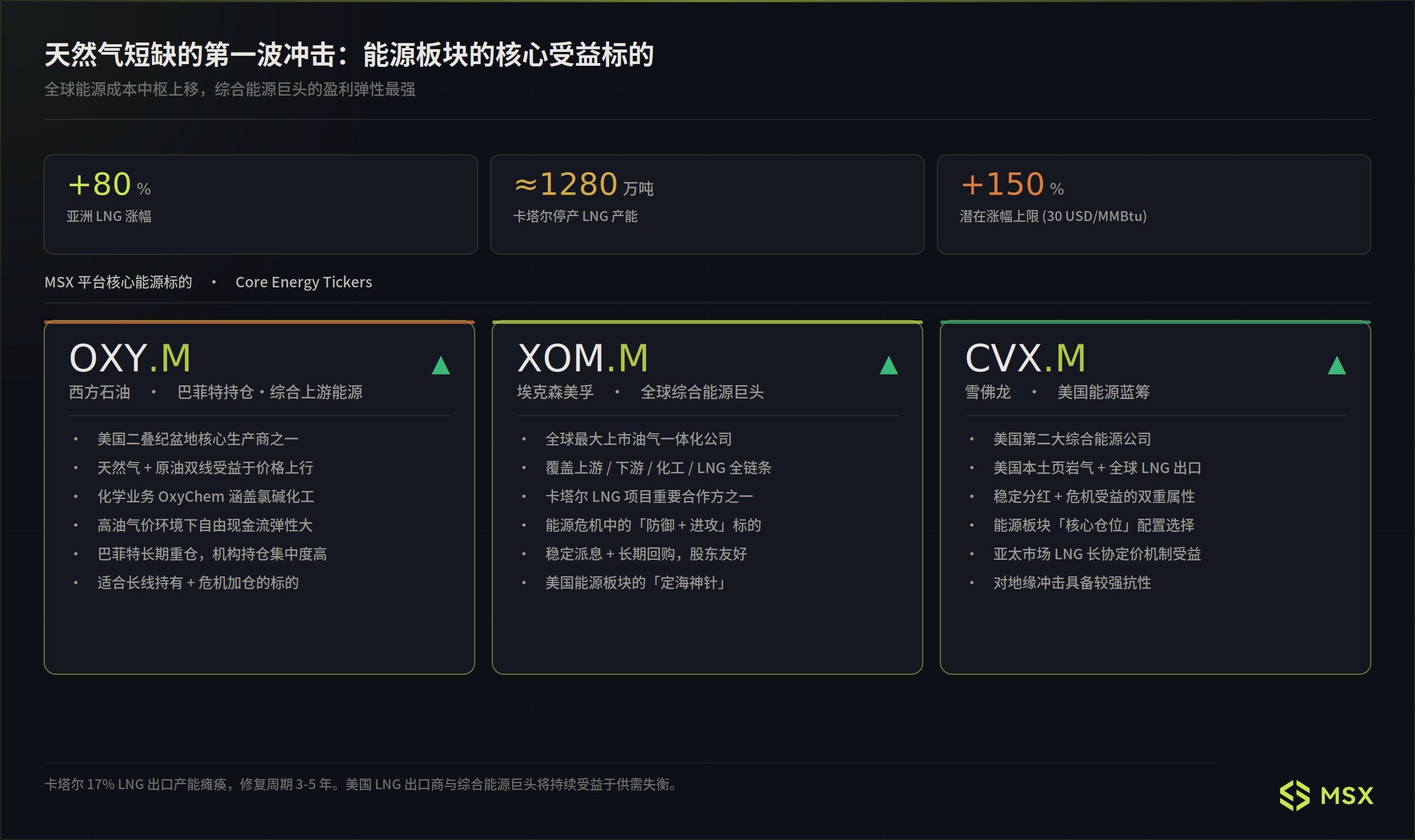 这条链条的受益方非常直接,即美国等非中东 LNG 出口商,以及具备稳定产能和出口能力的能源企业,无疑会成为替代供应的最大赢家,譬如 MSX 已上线的 OXY.M 、 XOM.M 、 CVX.M , 分别对应巴菲特长期持仓的西方石油、全球油气一体化龙头埃克森美孚,以及兼具美国本土页岩气和全球 LNG 出口能力的雪佛龙。