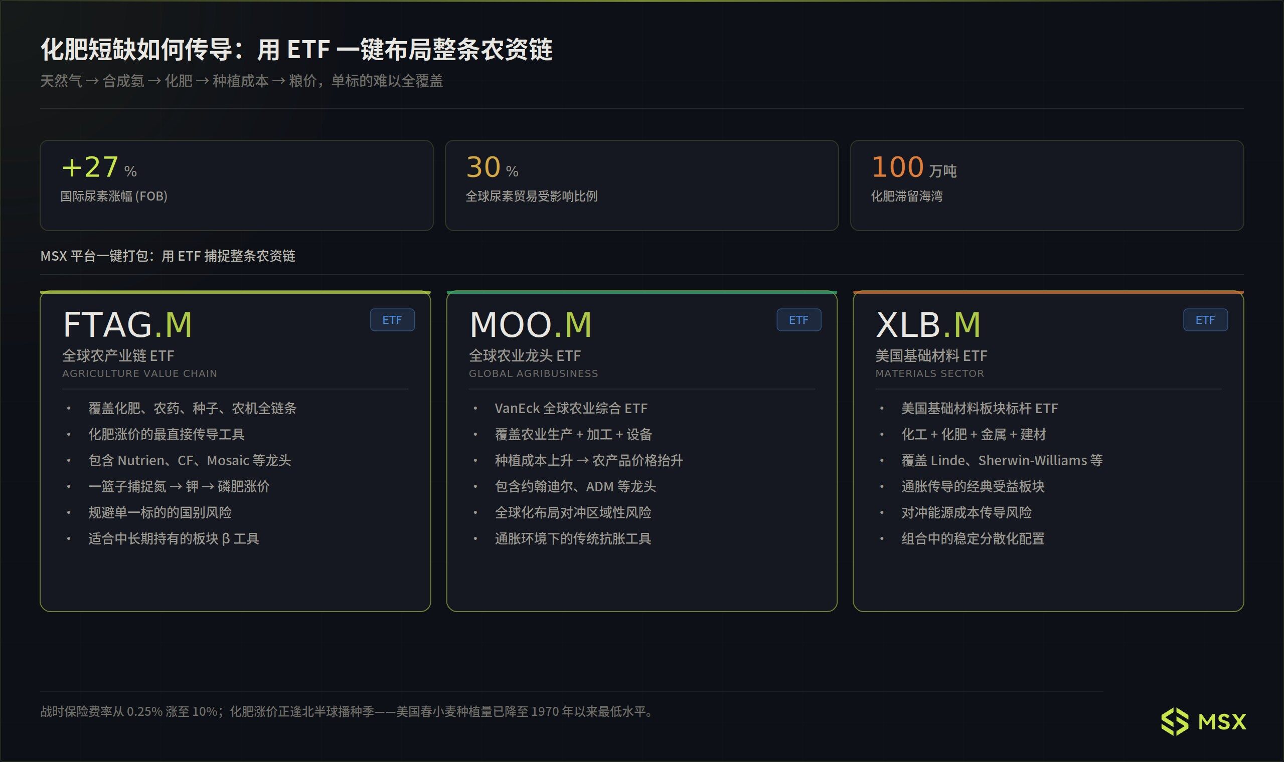 不过化肥链条的难点在于,单一化肥公司往往难以完整覆盖天然气、合成氨、尿素、农产品和基础材料之间的复杂传导,因此 ETF 代币反而更适合承接这类中长期逻辑,像 MSX 已上线的 FTAG.M、MOO.M、XLB.M,分别对应全球农业产业链、全球农业龙头以及美国基础材料板块: