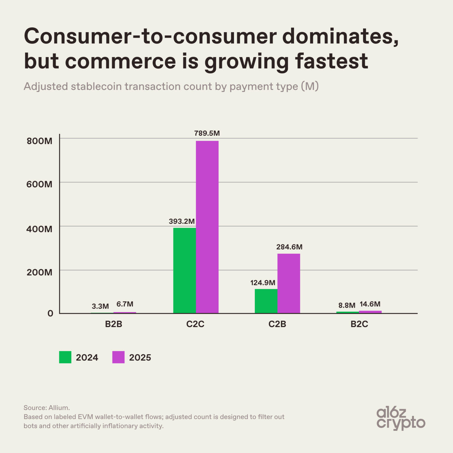 尽管点对点转账依旧是稳定币第一大使用场景,但日常商业支付的占比正在稳步提升。