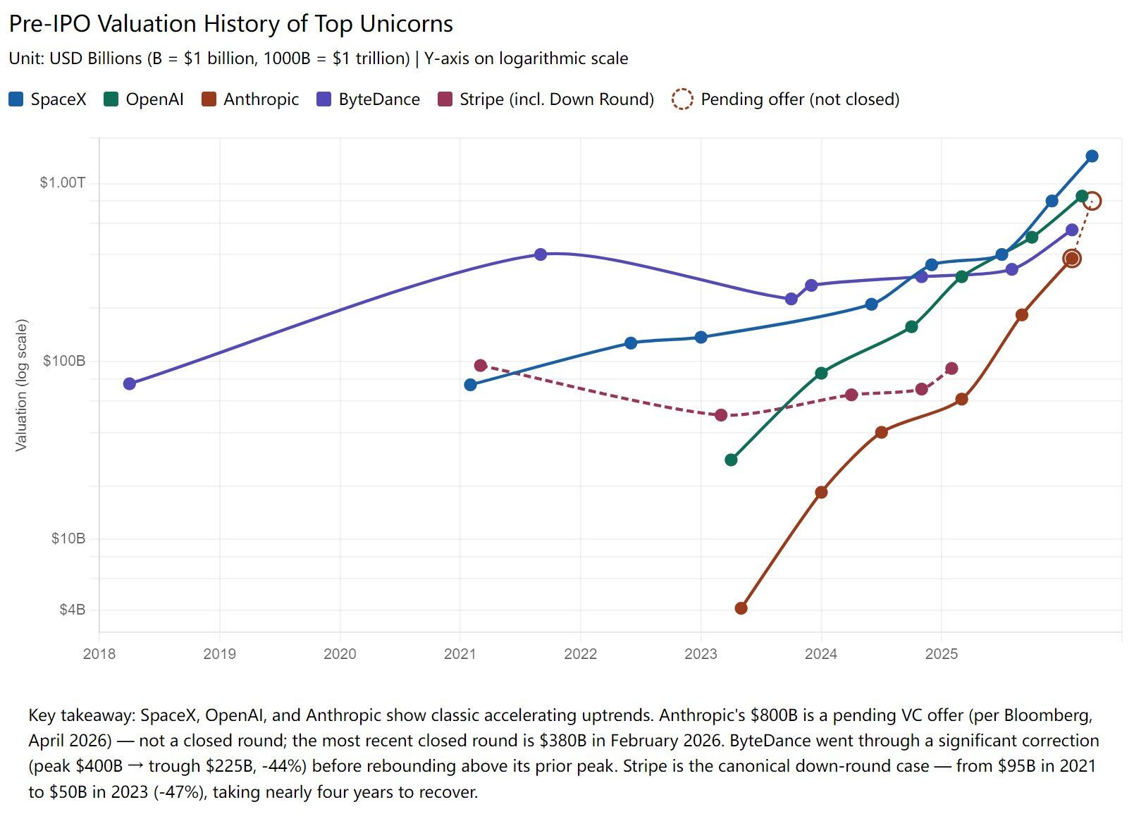 头部优质标的的融资估值通常单调上行。SpaceX从2021年的$74B涨到现在的$1.4T+,OpenAI从$29B涨到$852B+,Anthropic从$4B涨到$800B+,字节从$75B涨到$600B+。每一轮新融资都在抬高估值,老股东随之水涨船高。