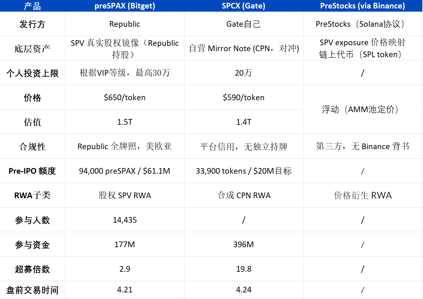 - 4月,Bitget、Gate、Binance(PreStocks)三家头部交易所几乎同时上线了SpaceX相关的代币化产品。合规方式各有区别,但其本质都是,将过去仅面对超高净值客户的pre-IPO市场份额,拆成碎片卖给散户。