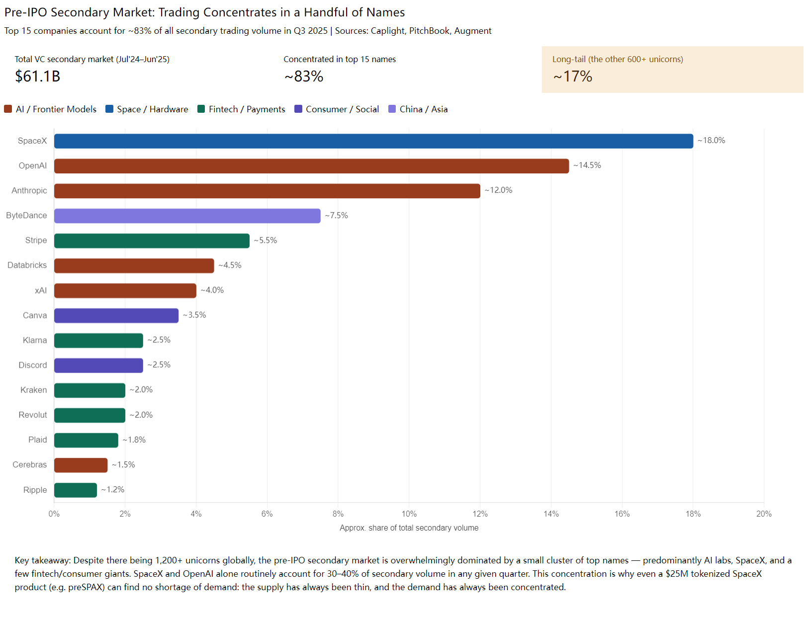 由于二级市场的交易高度集中在头部少数标的, SpaceX、OpenAI、Anthropic等美国AI/航天巨头长期占据交易量的30-40% ,加上字节、Stripe、Databricks、xAI等头部独角兽,前15家就吃下了整个市场约83%的成交量。(这种集中度也是为什么哪怕Bitget/Gate这次只发SpaceX代币、单单一家就能轻易超募过亿, 头部Pre-IPO的供给一直很稀缺,需求很集中 。)