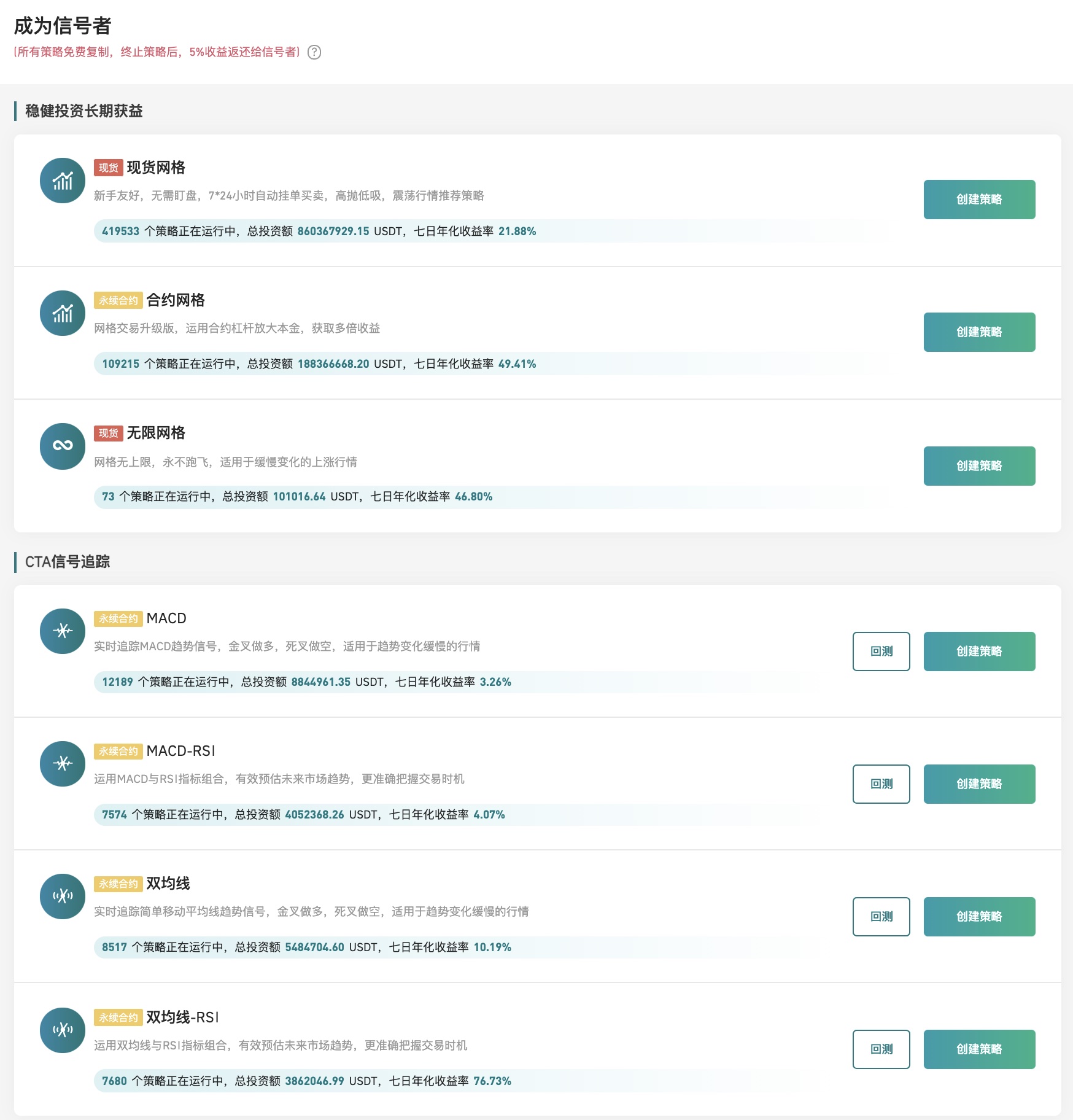 用户可通过在排行榜查看其他用户创建的策略收益表现,如果觉得某个策略收益比较好,可以对该策略运行参数进行复制,创建属于自己的策略。所有策略免费复制,终止策略后,5%收益返还给信号者
