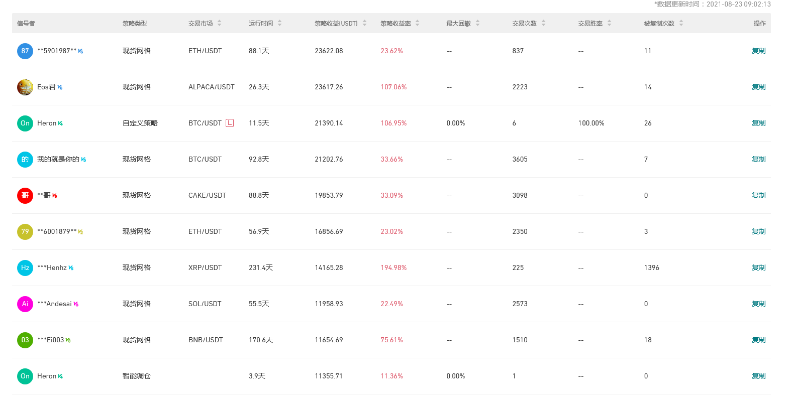用户可通过在排行榜查看其他用户创建的策略收益表现,如果觉得某个策略收益比较好,可以对该策略运行参数进行复制,创建属于自己的策略。所有策略免费复制,终止策略后,5%收益返还给信号者