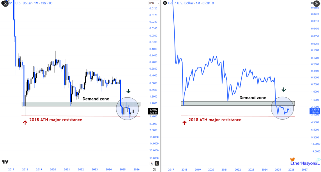 Technical calls are mixed. Ether Nasyonal, a crypto analyst, told followers that XRP is “cooking something” on the 1-month chart and highlighted an important demand zone.