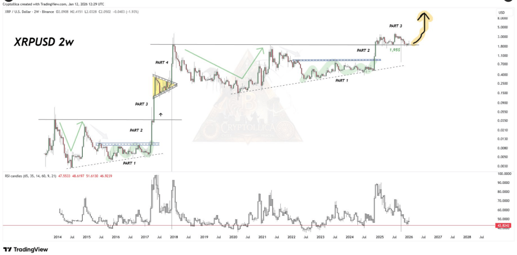 According to reports from an analyst known as Cryptollica, XRP’s price history can be split into a four-part sequence that often precedes big rallies. The first known cycle ran from 2014 into 2017, when XRP bottomed at $0.002 in July 2014 and then formed higher lows while trading above an upward support line.