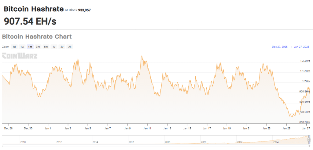 Based on reports from mining trackers, network hashrate fell sharply starting Friday and hit a low not seen in seven months by Sunday, dropping to about 663 EH/s. Within a day or so, as crews worked and weather systems moved on, the figure climbed back toward 854 EH/s.