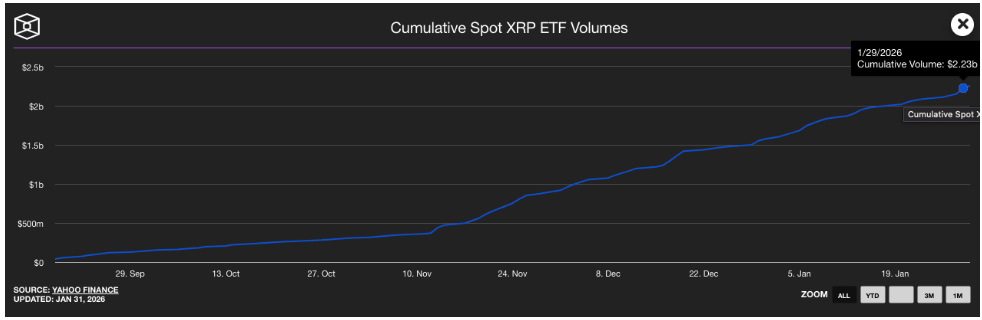 More impressively, Spot XRP ETFs achieved record trading volumes despite the overall downtrend. Data from The Block shows that XRP ETFs saw their cumulative volume rise to $2.23 billion from $2.15 billion just one day after the $92.9 million daily outflow. Reports indicated that Bitwise’s XRP ETF had the highest trading volume at the time, followed by Grayscale’s GXRP, Franklin Templeton’s XRPZ, Canary’s XRPC, and 21Shares TOXR, in that order.