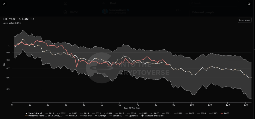 Data shows that Bitcoin tends to lose momentum in midterm years. Reports going back to 2014, 2018, and 2022 show a recurring sequence: prices start the year relatively stable, fade through late Q1 into early Q2, and then grind lower through the summer months. The 2026 price action has tracked this historical average closely.