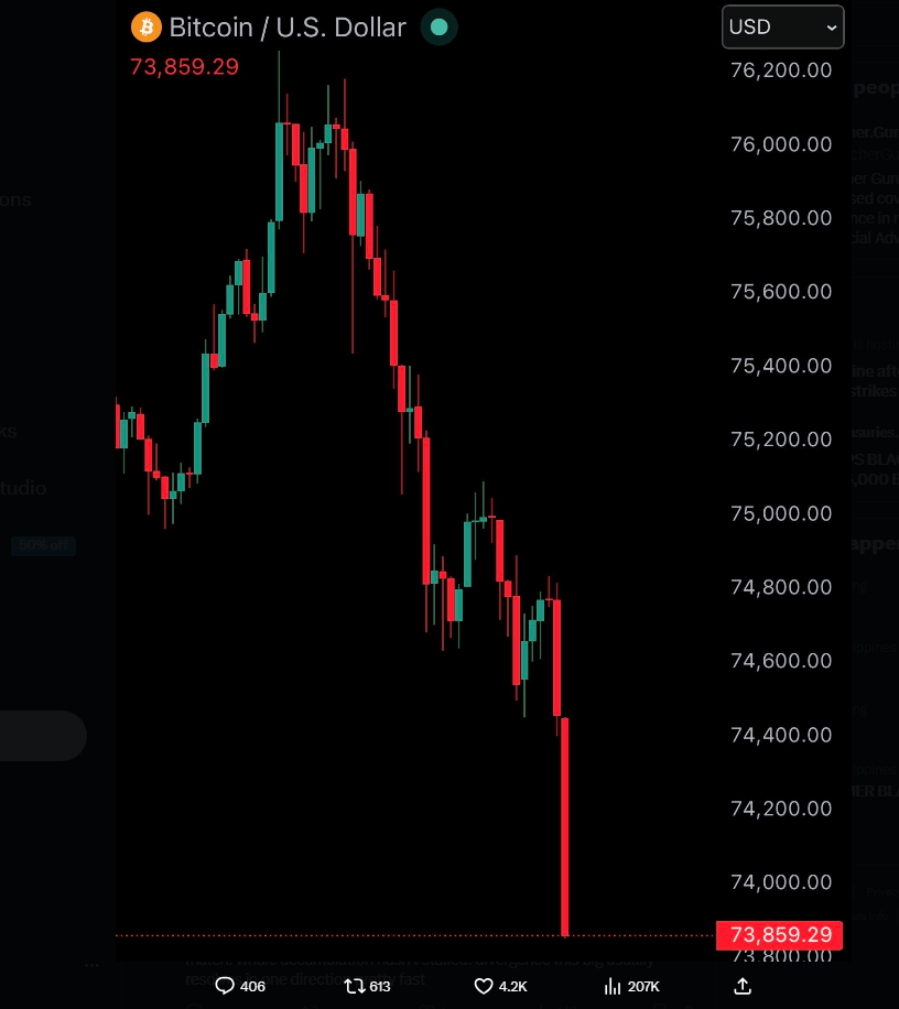 JUST IN: Bitcoin falls under $74,000 after Iran rejects second round of peace talks with the US. pic.twitter.com/Bxyx687J3a