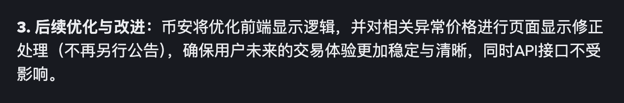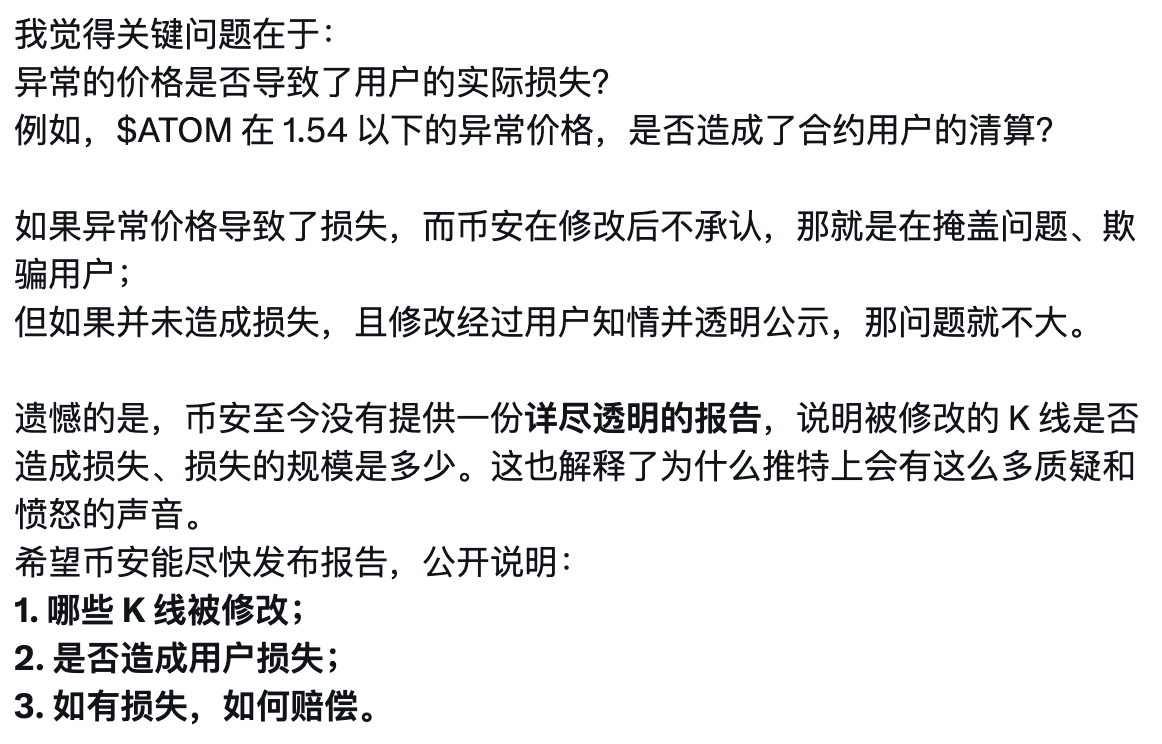 第一个以 WTF Academy 创始人 0xAA 的观点为代表,就是该份公告的信息不透明,币安并没有明确说明究竟有没有用户因为现货的极端价格出现损失,也没有明确说明会对哪些 K 线价格进行调整,仅仅是一句「不再另行公告」显得过分敷衍了事。