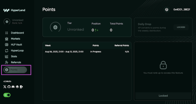 Hyperlendの「Points」ページで、預け入れや借入に応じて貯まるHLポイントを確認できます。