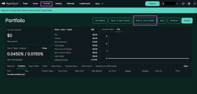 ①Portfolio →「EVM⇔Core Transfer」 をクリック