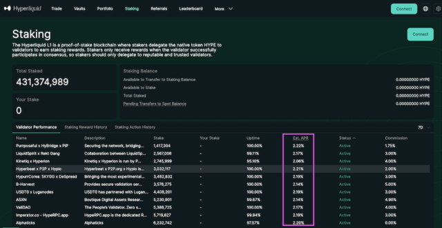 ステーキング報酬率は、「Staking」ページのバリデーター一覧にある 「Est. APR」列 で確認できます。各自の報酬額は、「Staking Reward History」タブで数量(HYPE単位)として表示されます。