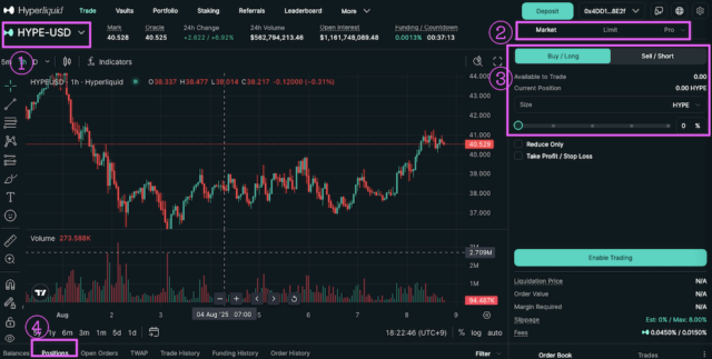 ・画面左上の検索バーから「HYPE-USD」など取引したいペアを選びます。