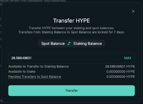 「Transfer」ボタンをクリックすると、ウォレットが署名を求めます。署名後、HYPEがStaking Balanceへ移動し、ステーキングが開始されます。