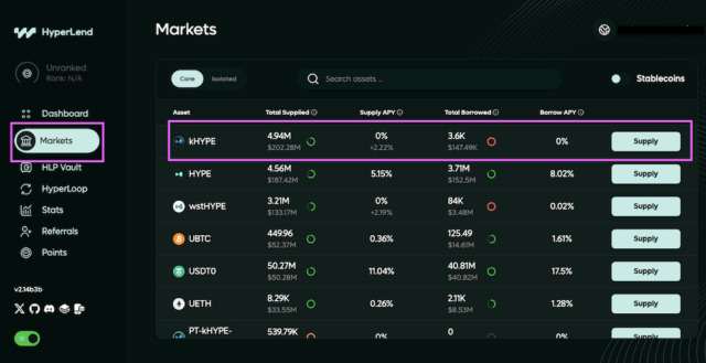 ②一覧から 「kHYPE」 を探し、右端の 「Supply」 ボタンをクリック