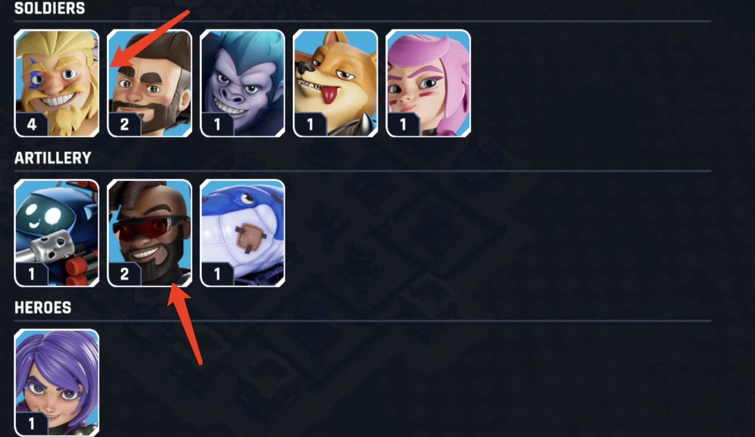 进行对战优先选择“STRIKER(锤子兵)”或“SKYFIRE(空战兵)”。 目前第一梯队绝大部分玩家都是使用单一的锤子兵或空战兵进行对战。其中,锤子兵的最大优势是“抗打”、“出战的数量上限高”、“攻击伤害高”,但需要提防冰塔与迫击炮的攻击,很容易出现派出几十个锤子兵一下子都死了的情况;空战兵的优势很突出,在 5 级前除了冰塔和防空塔外,其他防御攻击对它无效。但空战兵由于生命值低,一方面惧怕防空塔的不断消耗。另一方面惧怕冰塔的多个目标攻击。因此,无论选择锤子兵还是空战兵一定要通过 HERO 吸引火力后再派大量的兵进攻。