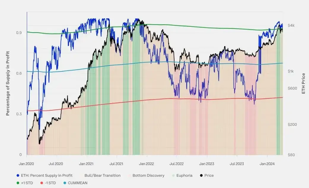 兴奋:在牛市中出现抛物线价格上涨趋势时,盈利供应的份额占主导地位(盈利供应的百分比 > 95% )。