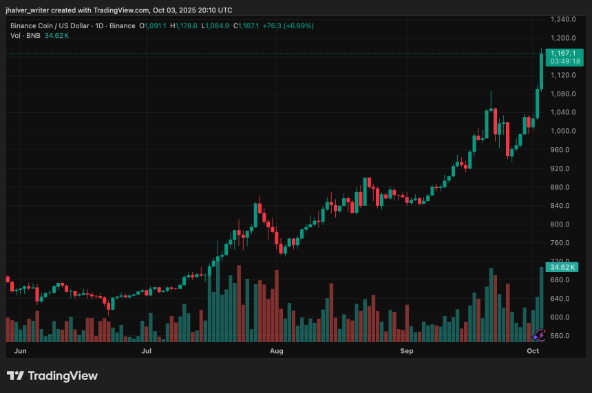 Binance Coin (BNB) Eyes Ethereum’s Lead After Surging Past $1,100 With 6% Rally