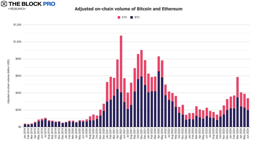 1、六月,比特币和以太坊调整后链上总交易额整体下跌了 13.4% ,降至 3380 亿美元,其中比特币和以太坊调整后链上交易额均下跌了 13.4% 。