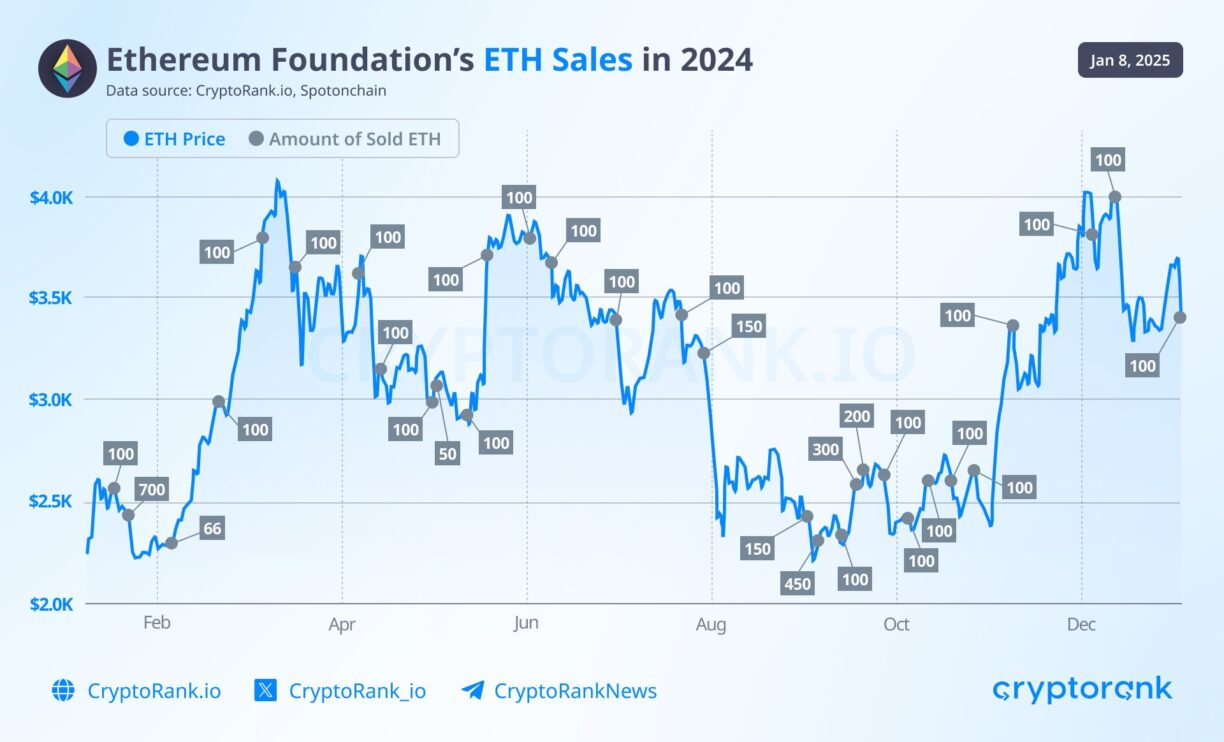 The Ethereum Foundation has a history of selling ETH before market pullbacks. In 2024 alone, it sold 4,466 ETH for roughly $12.61 million, averaging about $2,823 per coin. Key sales included 700 ETH in January and another 450 ETH in August—both shortly before price drops.