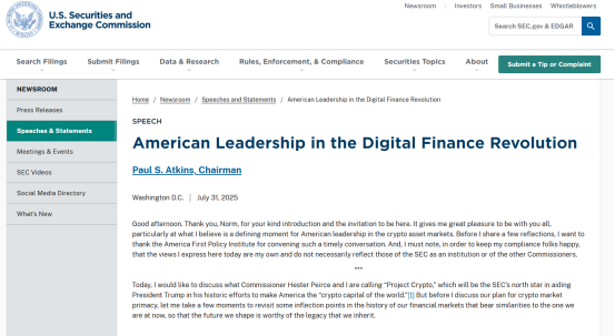 7月31日,正好就在香港稳定币条例生效的前一天,美国证券交易委员会(SEC)的新任主席Paul Atkins,就给币圈点燃了一把火。当天,Paul Atkins发布名为“Project Crypto”的新政,提出了让美国金融市场全面上链的雄伟构想,明确表示将实现美国“全球加密之都”的愿景。