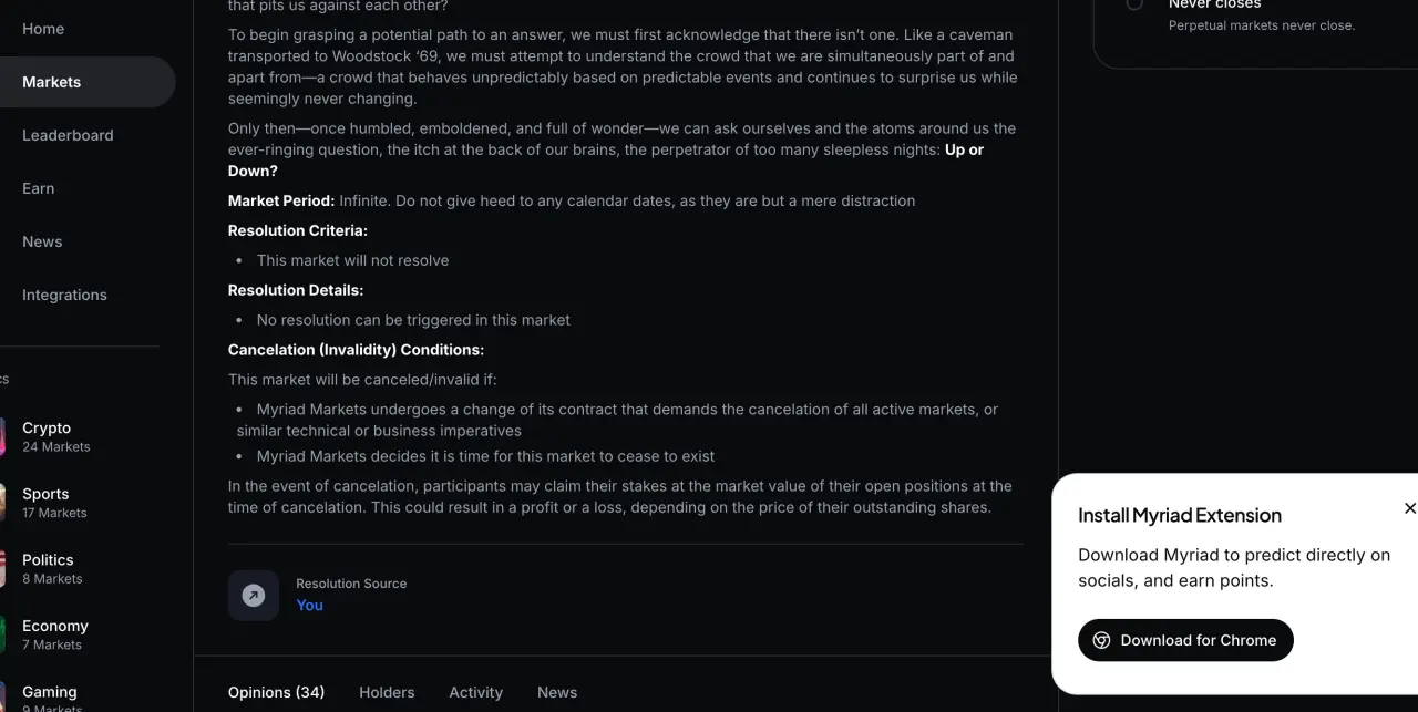 Myriad 由 Decrypt 和 Rug Radio 的母公司 DASTAN 孵化打造,通过浏览器扩展程序,将基于区块链的预测市场无缝嵌入到推特、 YouTube 、 Decrypt 等新闻与社交媒体页面中。用户可在日常浏览内容时,便捷地使用 USDC 或平台积分直接参与预测,实现“一键下单”。其预测话题广泛覆盖加密货币、政治、体育及文化等多个领域。 平台基于 Abstract 、 Linea 和 Celo 等区块链 构建。