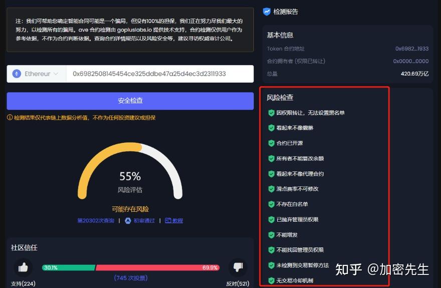 - 不同区块链、不同代币功能的风险各有不同。如果你特别在意风险这件事,那就不要创建功能代币,可以创建标准代币,风险检测全绿。因为只要带功能,就有可能有风险