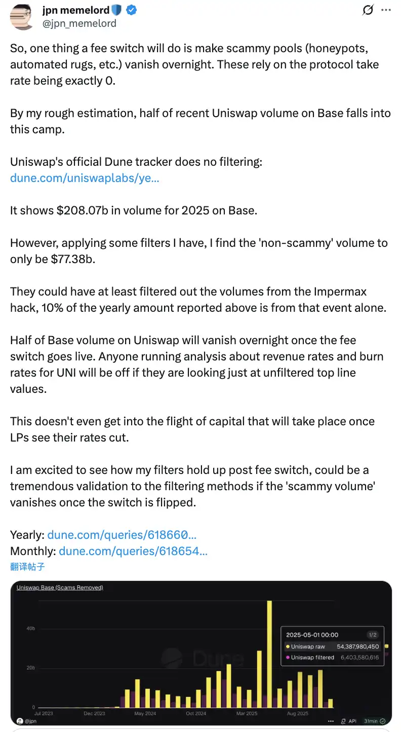 也就是说,通过费用开关,UNI 将从一个「无价值的治理代币」转变为真正的收益资产。
