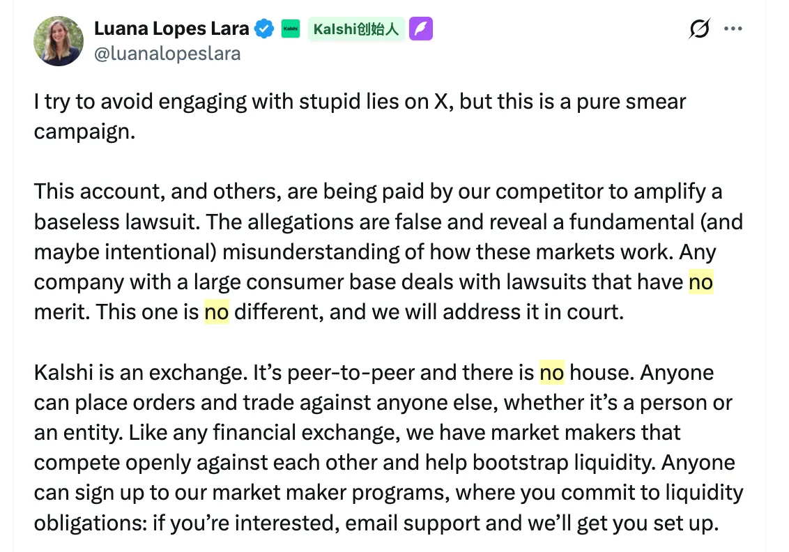 面对指控,Kalshi 联合创始人 Luana Lopes Lara 迅速反击 ,称诉讼是“基于对衍生品市场机制的根本性误解”。她的辩护逻辑符合标准金融市场的常识: