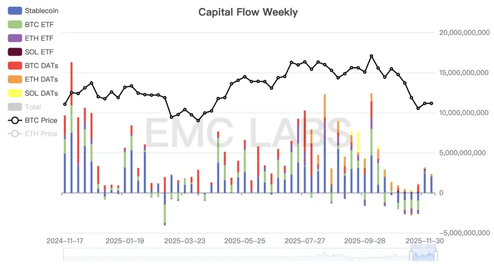 12月1日,美联储停止QT并通过临时回购(Repo)提供约165亿美元短期流动性。美国财政部做了两次美债“回购”,合计 145 亿美元。这稍微缓解了市场短期流动性,但尚不足以对BTC这类高β资产形成流入促进。