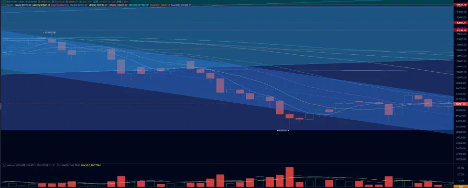 本周BTC开于90364.00美元,收于94181.41,全周上涨0.04%,振幅11.49%,成交量与上周持平。
